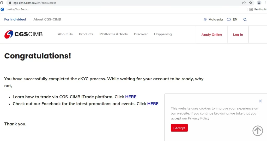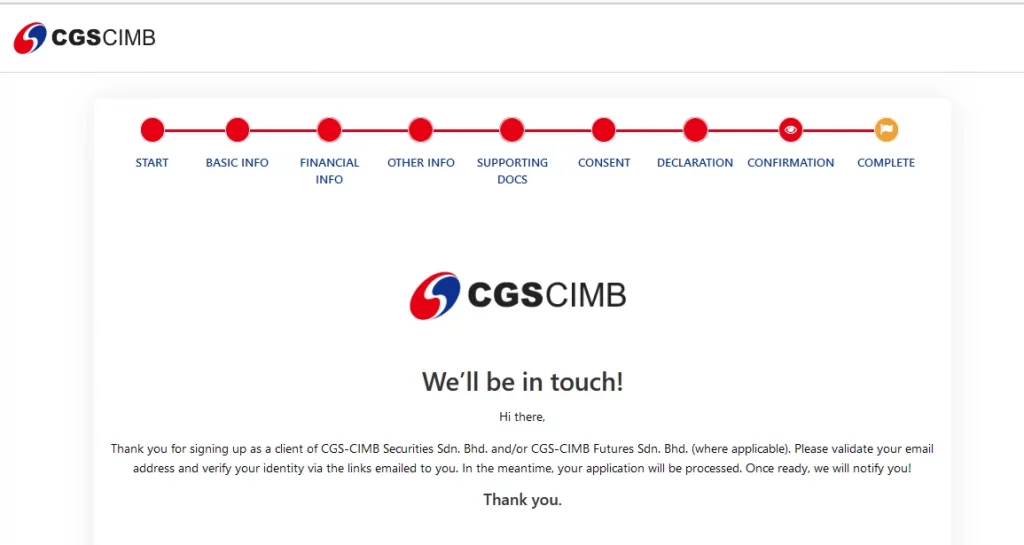 当屏幕显示这个页面时,恭喜你完成了 CGS CIMB 的实名认证流程!