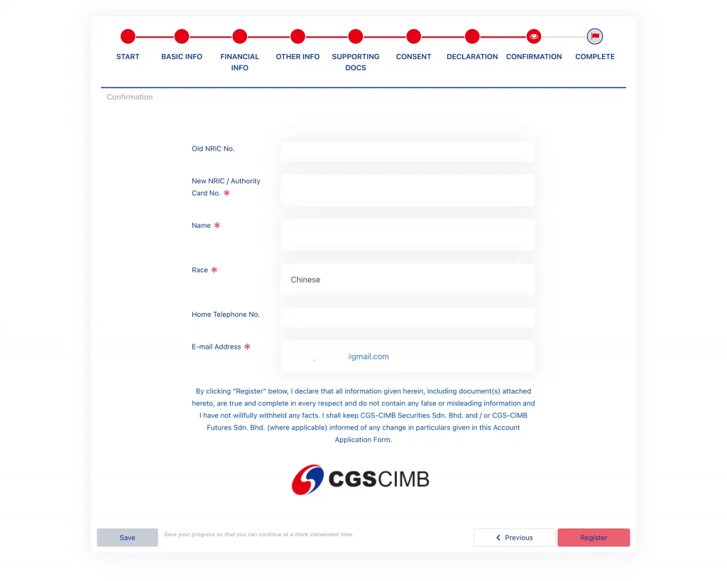 点击信息中的链接,并且输入指定的Recovery Code,你将会被带到CGS CIMB开户流程中的「申报合规信息 Declaration」页面。