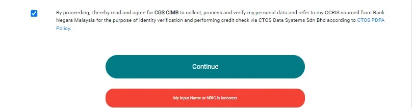 如果页面中所显示的名字和身份证号码无误,便可 ✔ 打勾,表示已阅读和同意 CGS CIMB 收集、处理并验证你的个人资料,以及向马来西亚中央政府参考用户的银行信用资料(CCRIS),让 CGS CIMB 验证用户身份并且透过 CTOS 来检查你的信用。