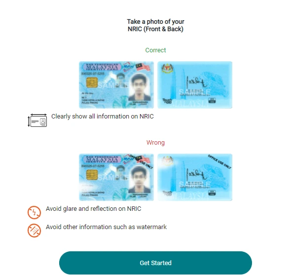 这里显示正确的拍摄马来西亚身份证的方式。身份证上的资料必须清晰,避免强光反射,或者是有水印、字眼显示在身份证上。了解后即可点击开始「Get Started」。