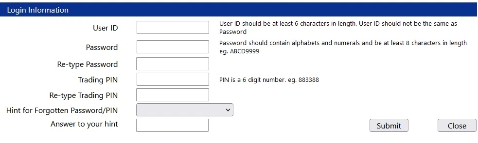 接着,设立并填写你的用户账号(User ID)、密码(Password)、再次输入密码(Re-type Password)、交易号码(Trading Pin)、再次输入交易号码(Re-type Trading Pin)、选择密码 / 交易号码提示(Hint for Forgotten Password/Pin)、提供提示的答案(Answer to your hint)。