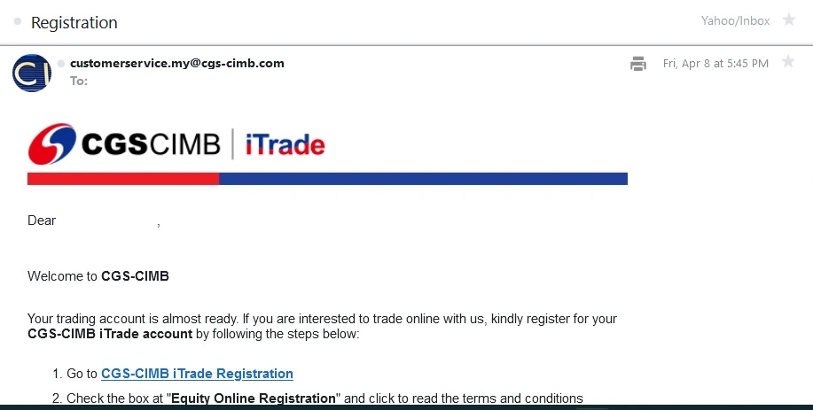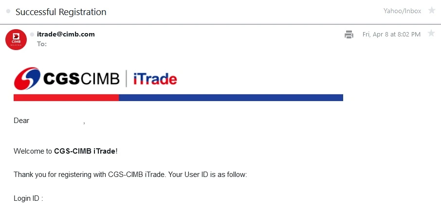 CGS CIMB 审核资料后(4-5 个工作日后),将会发送电子邮件给你,标题是「Registration」。在电邮里,点击「CGS-CIMB iTrade Registration」链接。