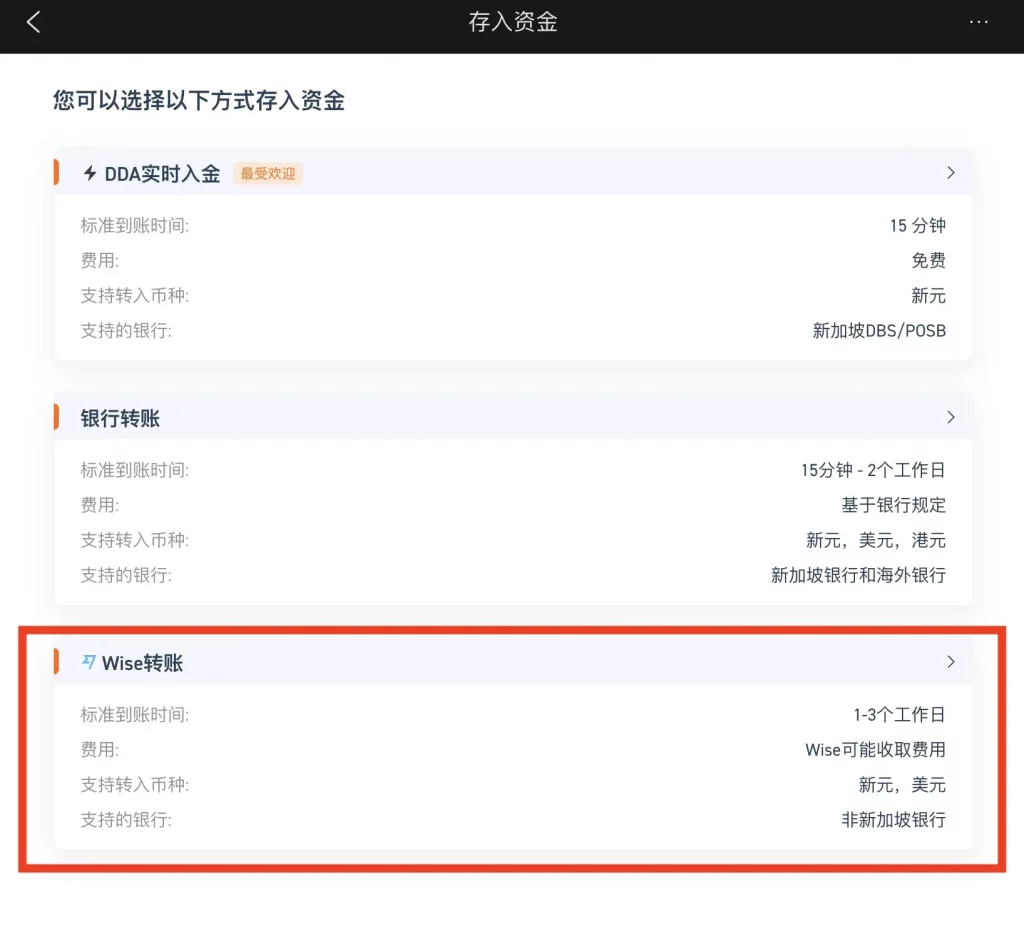 以个人经验而言,Wise 入金的方式容易操作,且 Wise 网站界面简单好用,且提供更换语言选项,整个入金体验非常流畅顺利,推荐没有新加坡银行户口的用户使用 Wise 入金。