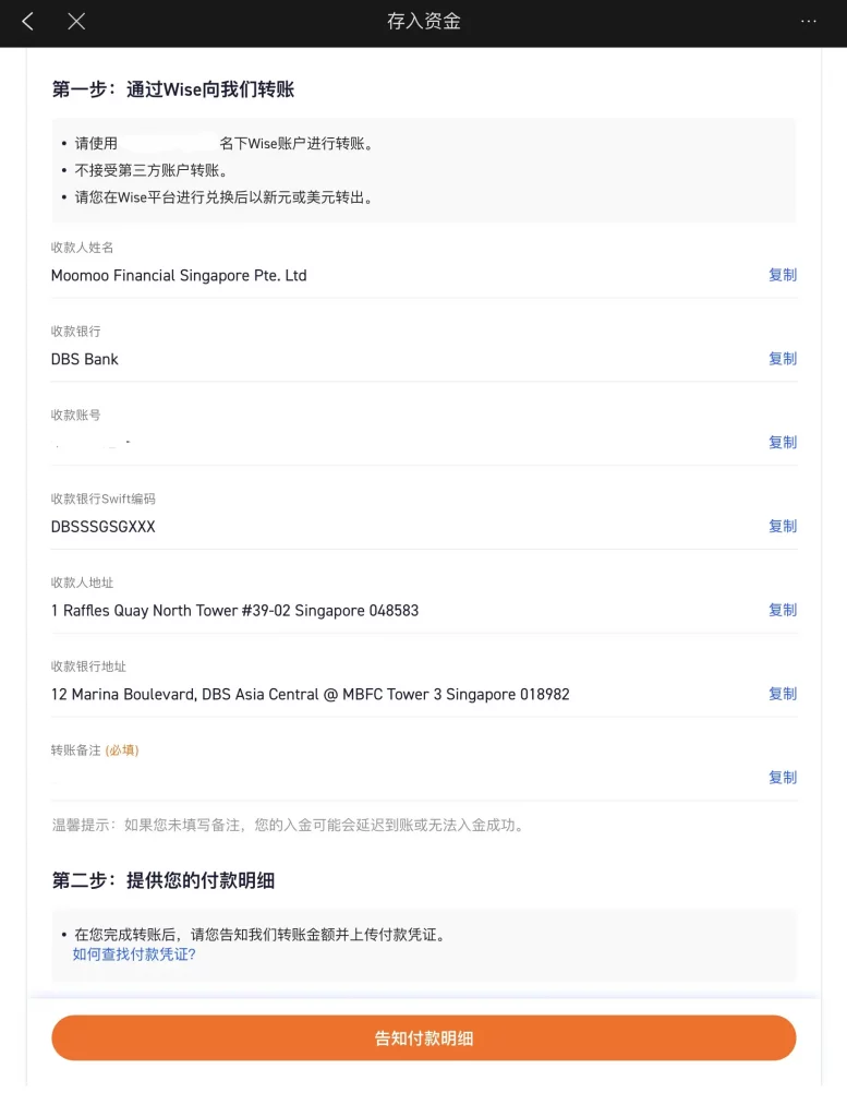 完成本地银行转账汇款后,等待 Wise 将资金发往 Futu Singapore,接着要告知 moomoo 审核资金。这里共分为两个部分处理: